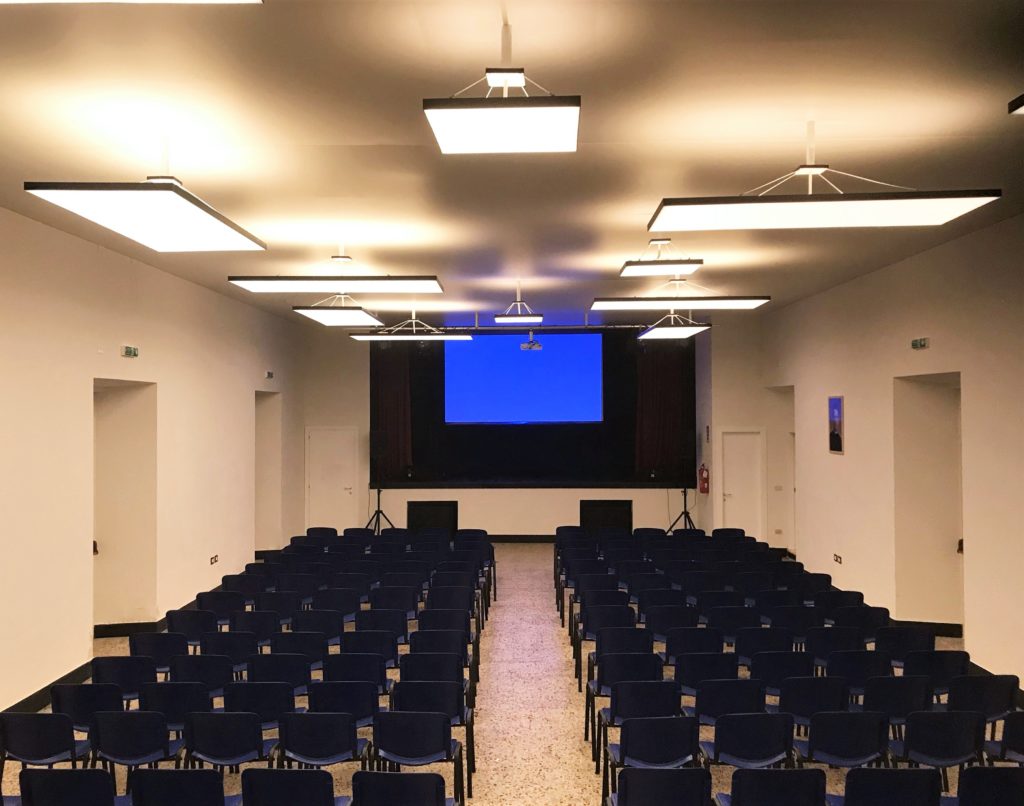 Essendo questo uno spazio dedito specialmente a opere e rassegne teatrali , abbiamo optato per una controsofittatura in pvc termoteso con proprietà fonoassorbenti , così da poter limitare sia l’eco in sala che i suoni verso l’esterno dell’edificio.