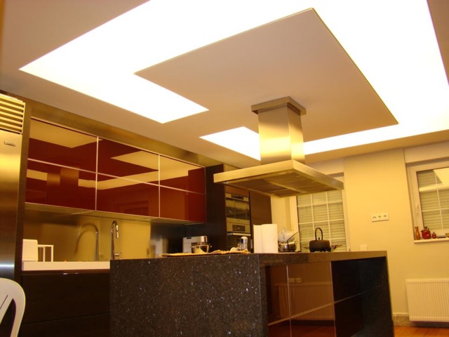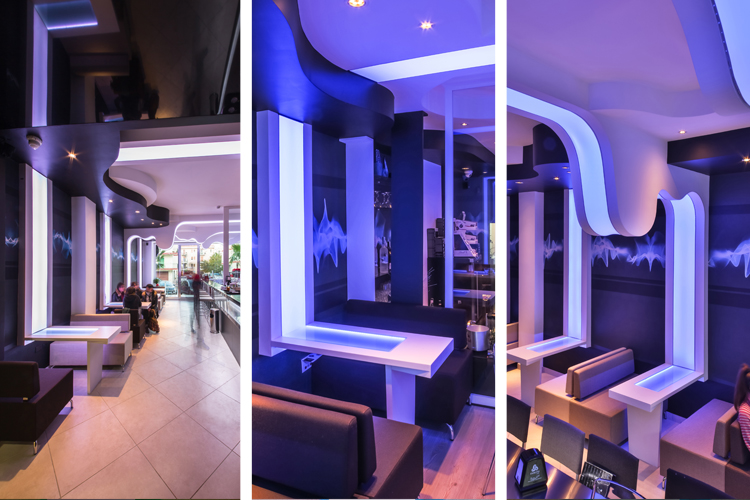 Per questo lavoro abbiamo realizzato una serie di incassi in cartongesso, dove all'interno abbiamo montato un impianto luci a catodo freddo e lungo il perimetro strisce led RGB.